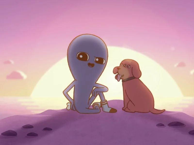 В розово-фиолетовой вселенной инопланетные существа исследуют абсурдность человеческой жизни.